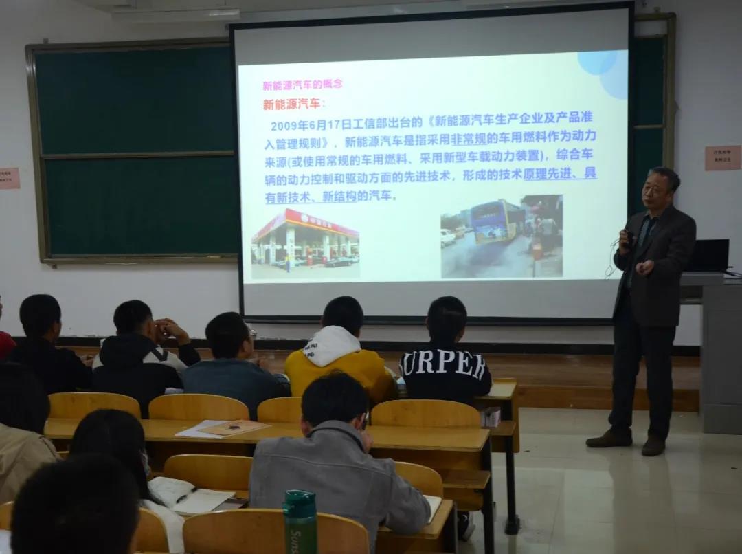 其中张永学张教授在师生热烈的掌声中讲解了自己对新能源汽车的见解。首先是新能源汽车的概念问题,让学生们初次认识了新能源汽车和普通汽车的区别,使学生们在新能源汽车知识层面得到了提升。
