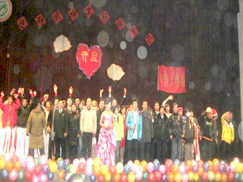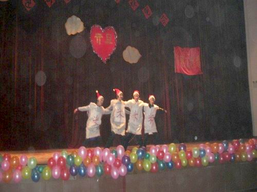 晚会节目精彩纷呈,从现代舞到民族舞,从小品到相声,形式新颖的音乐剧、戏曲、表演精彩的双簧、动感活力的街舞、美丽浪漫的服装秀、二胡、 萨克斯独奏、少林武术更是为晚会添加了不少亮点,晚会中间圣诞老人的互动环节别出心裁的调节了会场气氛,张晓飞等同学表演的《换大米进行曲》通过肢体语言和美妙歌声更是把晚会推向了高潮。