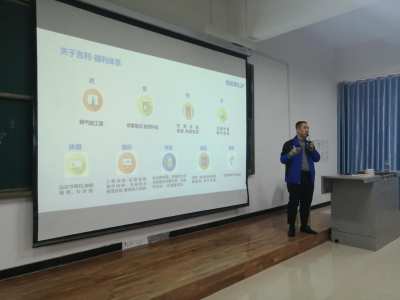 吉利汽车集团吴经理从集团概况、企业文化、企业员工培养模式、企业目前的发展状况及发展前景与同学们作了详尽的分享。在宣讲会的互动环节,同学们也就自己所关心的专业对口、企业所需求的人才素质、公司发展平台与机会等问题进行了互动交流。吴经理再次对同学们最为关心的岗位需求、工作周期进行了详细具体的解答,并多次强调本次校园宣讲会,是让同学们提前接触社会、提前进入职场状态的机会。吴经理的解答得到参会同学们的认同。