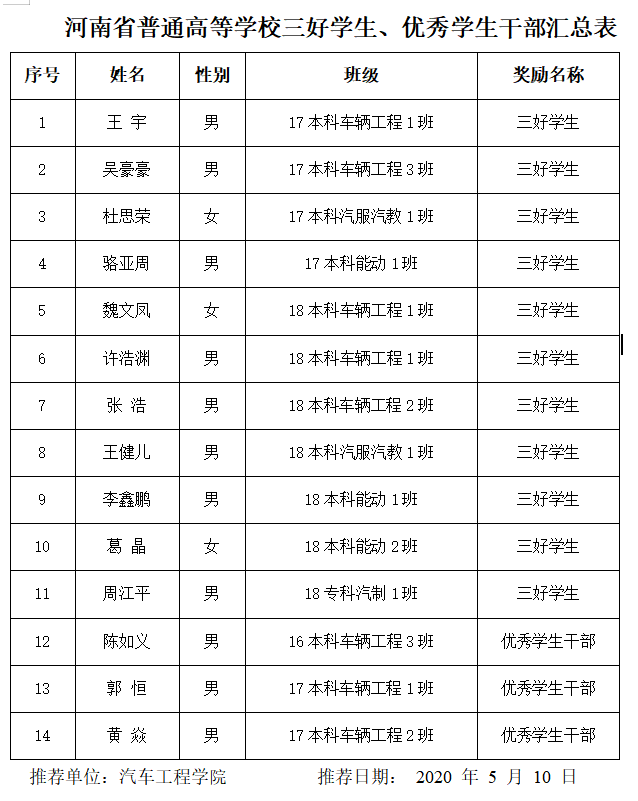 为深入贯彻习近平新时代中国特色社会主义思想和党的十九大及十九届二中、三中、四中全会精神,全面落实全国、全省教育大会的决策部署,坚持立德树人的根本任务,培育和践行社会主义核心价值观,培养德智体美劳全面发展的社会主义建设者和接班人,展示当代青年学生积极进取、奋发向上的精神风貌。根据河南省教育厅、共青团河南省委文件精神,决定继续开展 2020 年河南省普通高等学校三好学生、优秀学生干部和先进班集体评选表彰活动。