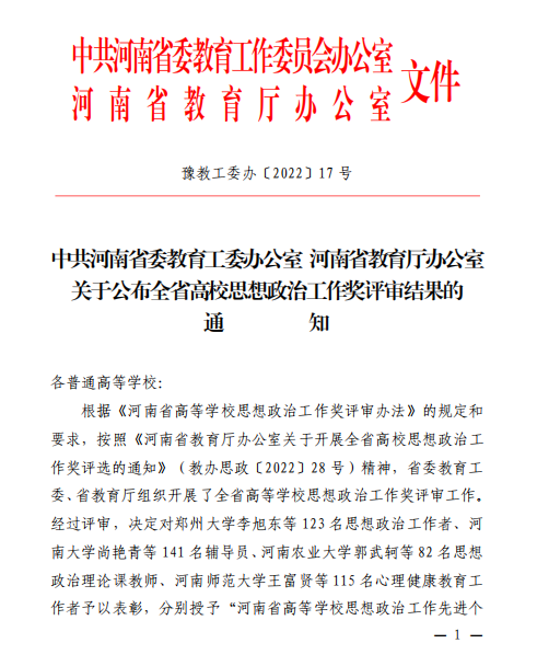 近日,中共河南省教育工委河南省教育厅联合印发《中共河南省委教育工委办公室 河南省教育厅办公室 关于公布全省高校思想政治工作奖评审结果的通知》(教办思政〔2022〕28号)。我院辅导员聂海振被授予“河南省优秀辅导员”荣誉称号。